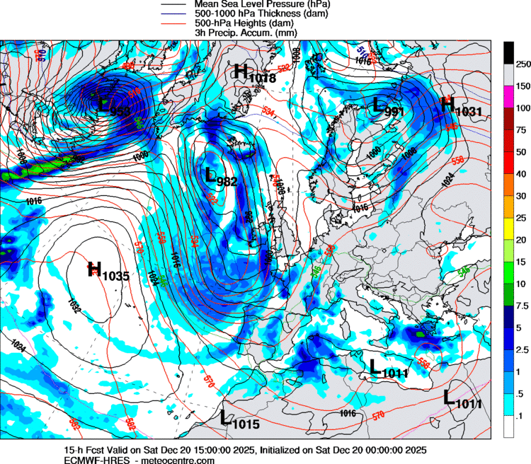 France lies south of the main storm track, but Lyon, Milan, and northern Italy are already feeling the effects of the trailing cold front. Thunderstorms are embedded within the frontal band. For Spain and the western Mediterranean, calmer weather dominates, though cooler air is filtering in from the Atlantic.