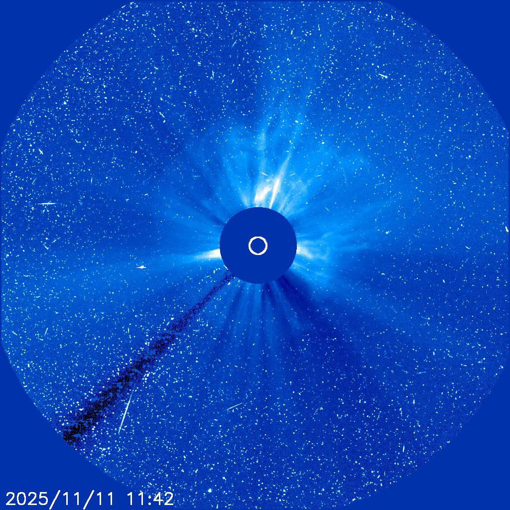 Сегодня зафиксированы три быстрых корональных выброса массы (CME) подряд. Один из них, по данным SWPC, может двигаться со скоростью до 1400 км/с. Это — крайне высокая скорость для CME и потенциальный инициатор шторма уровня G5, если удар придётся точно в Землю.