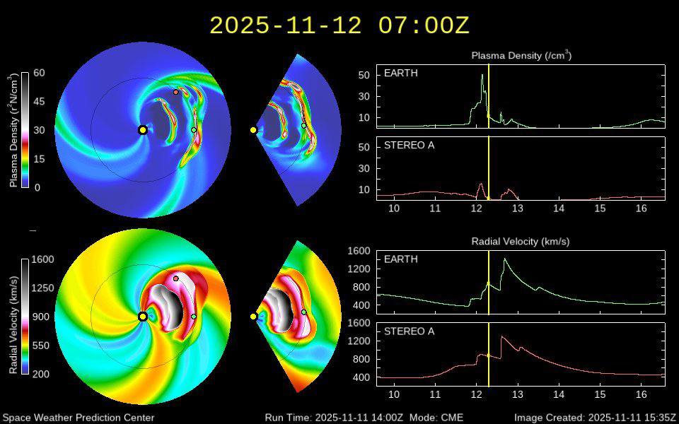 По данным модели WSA-ENLIL, удар ожидается уже завтра, 13 ноября, около 16:00–17:00 UTC.