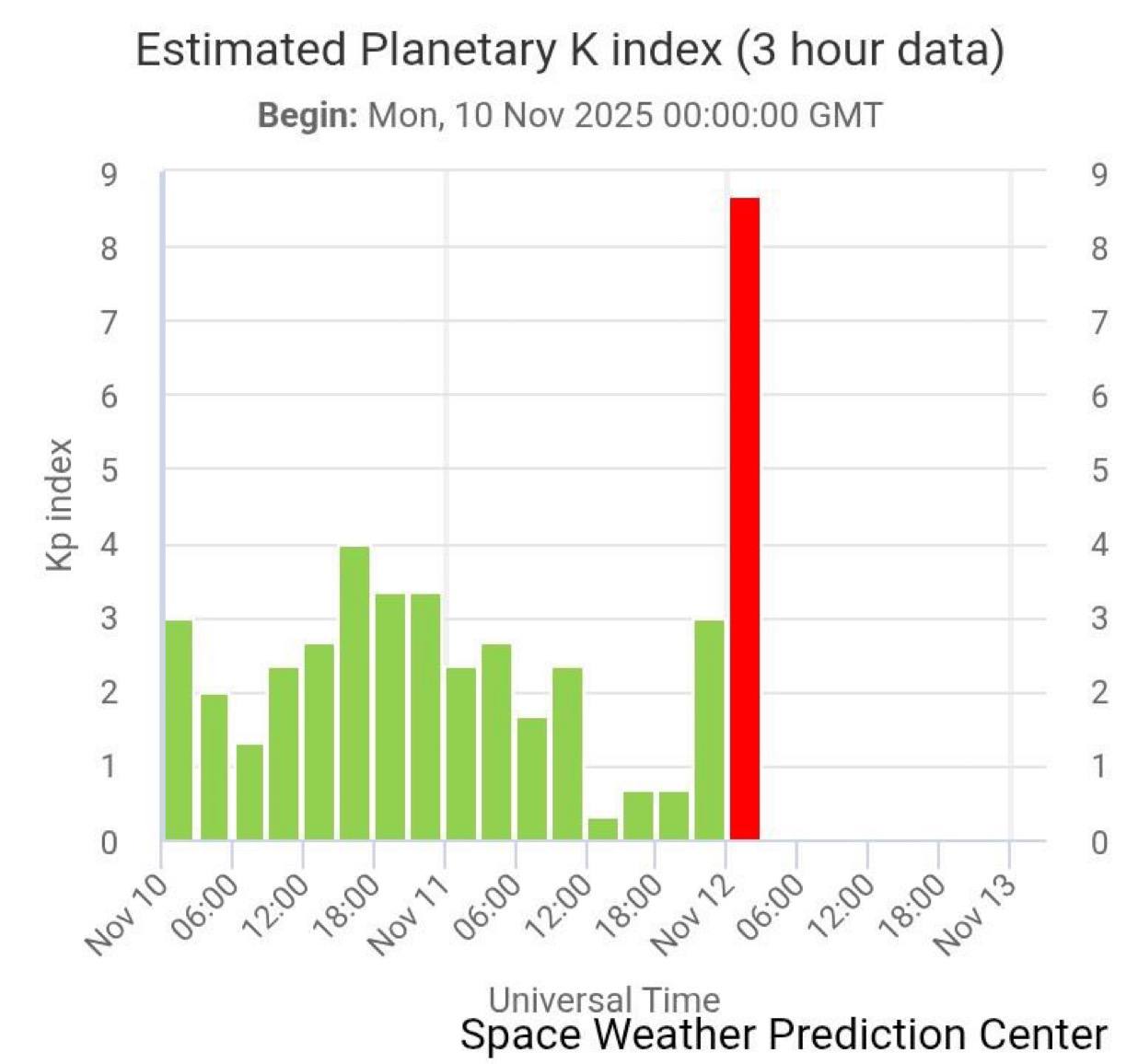 - На ночь 12 ноября прогнозируется продолжение геомагнитной активности: продукция NOAA указывает на возможное расширение зоны видимости сияния до более южных широт в США.
